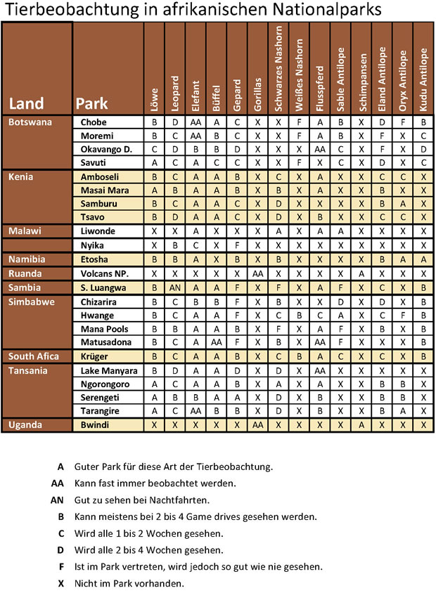 In der nachstehenden Tabelle, welche auch als PDF heruntergeladen werden kann, sieht man, welche Tierarten man in welchen Nationalparks in Afrika, wann am besten beobachten kann.
